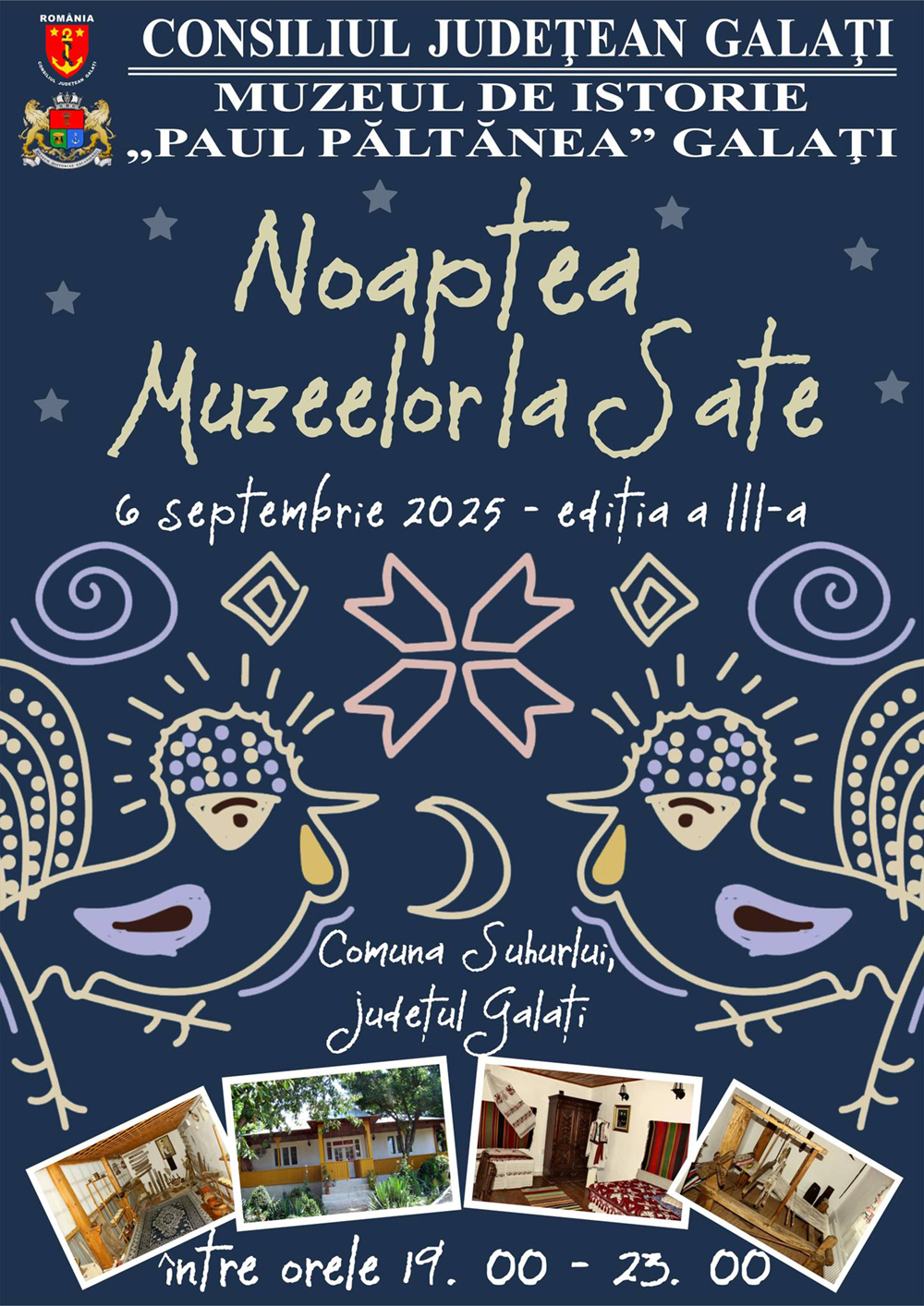 Vă aşteptăm cu drag să păşiţi în universul rural de altădată la Casa Rurală „Ion Avram Dunăreanu” din comuna Suhurlui, judeţul Galaţi, astăzi, 6 septembrie 2025, între orele 1900 – 2300!