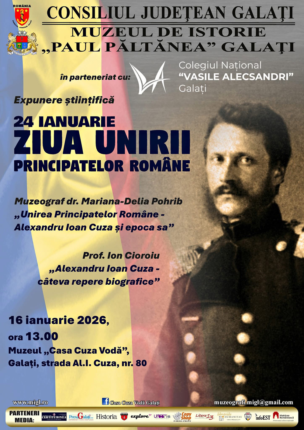 Astăzi, 16 ianuarie 2026, la ora 1300, la Muzeul „Casa Cuza Vodă” din Galaţi a avut loc o activitate dedicată Zilei Unirii Principatelor Române, care a adus în atenţie momentul istoric de la 24 ianuarie 1859 şi personalitatea domnitorului Alexandru Ioan Cuza.