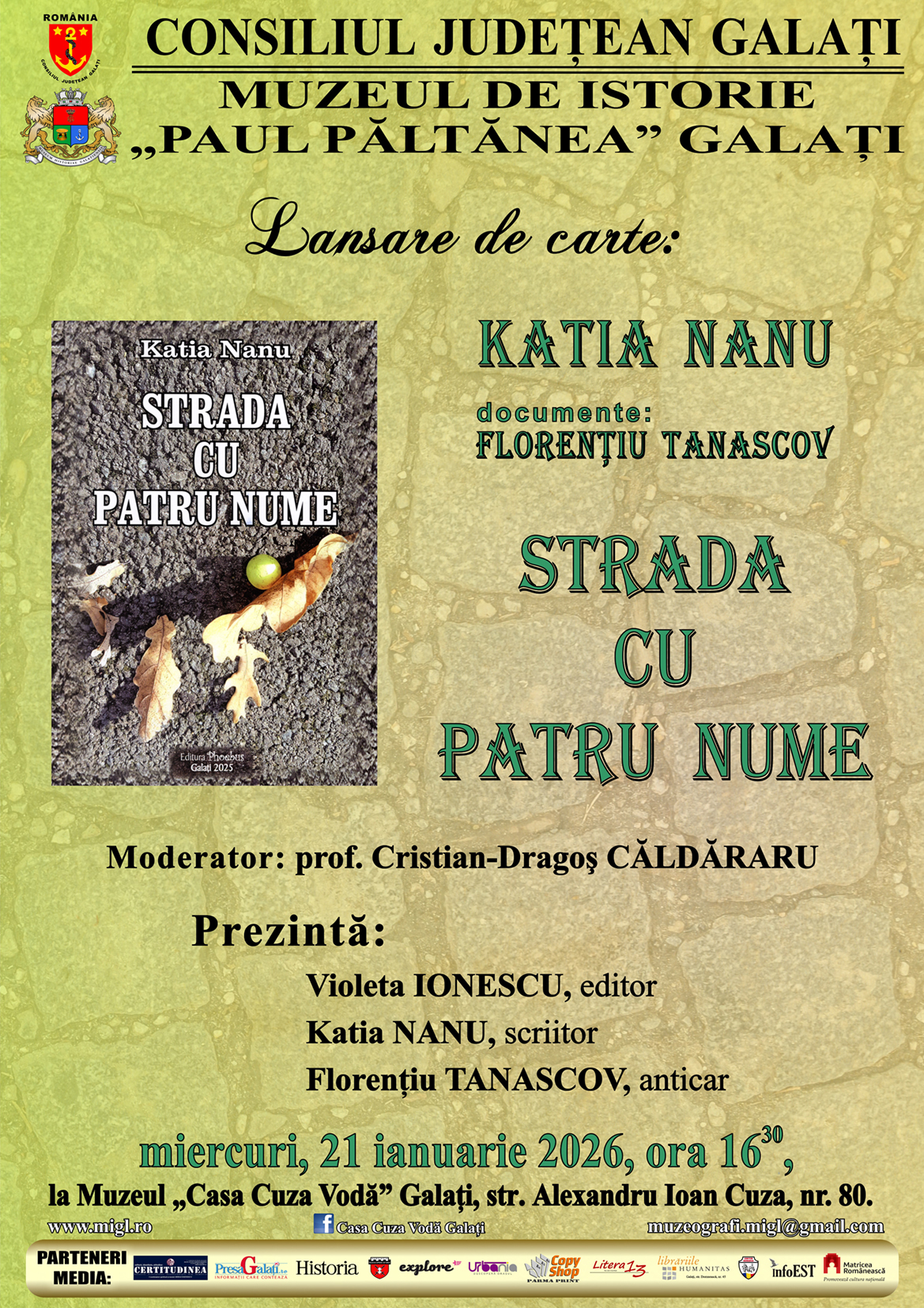 Vă invităm la lansarea volumului „Strada cu patru nume”, semnat de Katia Nanu, documente: Florenţiu Tanascov, un eveniment dedicat literaturii şi memoriei urbane, miercuri, 21 ianuarie 2026, ora 1630, la Muzeul „Casa Cuza Vodă” – Galaţi.